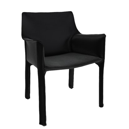La chaise Cab143 est la pièce principale de la collection Cab de l'italien néo-réaliste Mario Bellini. Cette chaise avec un cadre en acier est habillée à la main de 22 pièces en cuir reliées par des coutures et des fermetures éclairs sur une couche de rembourrage. La chaise est ainsi en quelque sorte habillée de cuir de haute qualité, qui confère à sa forme sobre un aspect doux et accueillant.
