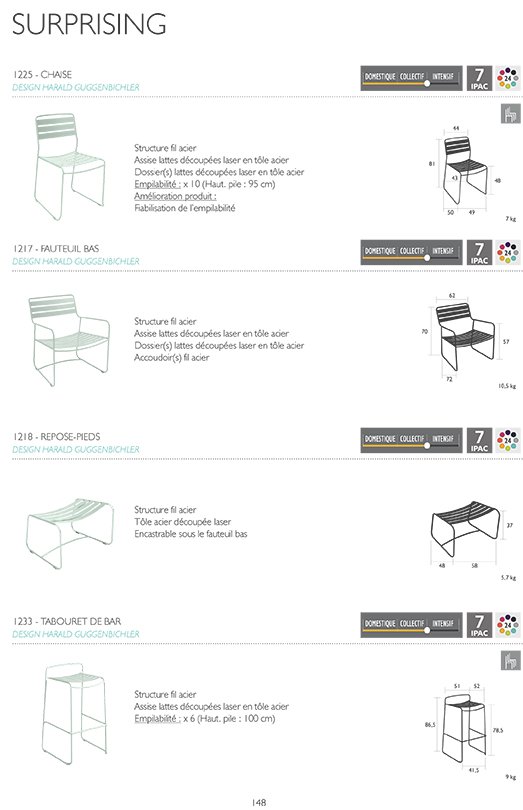 | Entretien | Veuillez utiliser un nettoyant doux et neutre sur un chiffon humide et chaud. En cas de rayures ou de rouille légère, ne poncez pas et intervenez rapidement avec les stylos et/ou sprays de retouche Fermob de la couleur exacte de votre meuble. Appliquez un produit de polissage (liquide ou pâteux) sur les pièces en acier inoxydable dès que les premiers signes de rouille apparaissent. Plus ces interventions sont rapides, moins la rouille se propagera. |