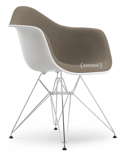 Eames Plastic Armchair RE DAR, Blanc non-RE, Rembourrage intégral, Gris chaud / marron marais, Version standard - 43 cm, Chromé