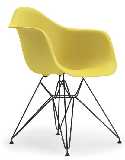 la résine de polyester renforcée de fibre de verre. Ce matériau présentait de nombreux avantages parmi lesquels sa souplesse, son prix abordable et la possibilité de produire les chaises en grandes séries. Cela correspondait donc tout à fait au mot d’ordre des designers Charles et Ray Eames: « Rendre le meilleur accessible au plus grand nombre ». Aujourd’hui, les chaises « Eames Plastic Chairs » sont en polypropylène et disponibles avec différents piétements sous forme de fauteuils « Eames Armchairs » ou de chaises « Side Chairs ». Enfin, DAR signifie Dining height Armchair Rod Base, ce qui fait référence à une chaise de salle à manger à quatre pieds en fils d’acier.