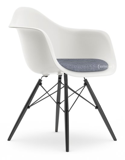 Eames Plastic Armchair RE DAW, Blanc non-RE, Avec coussin d'assise, Bleu foncé / ivoire, Version standard - 43 cm, Érable noir