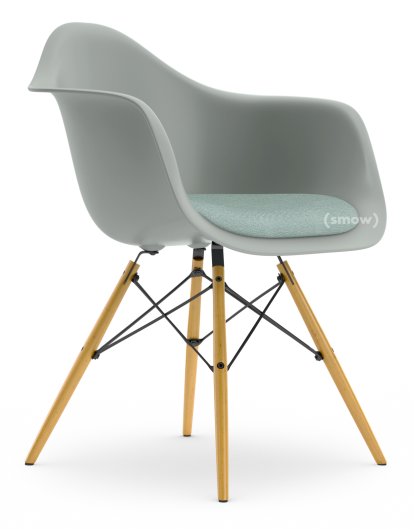Eames Plastic Armchair RE DAW, Gris clair, Avec coussin d'assise, Bleu glacier / ivoire, Version standard - 43 cm, Érable nuance de jaune