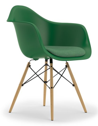 Eames Plastic Armchair RE DAW, Vert émeraude, Avec coussin d'assise, Vert / ivoire, Version standard - 43 cm, Érable nuance de jaune