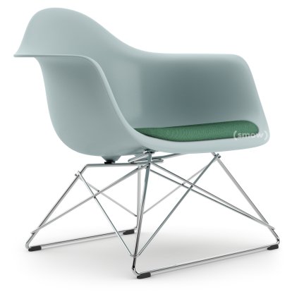 Eames Plastic Armchair RE LAR, Gris bleuté, Coussin d'assise menthe / forêt, Chromé
