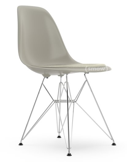Eames Plastic Side Chair RE DSR, Galet, Avec coussin d'assise, Gris chaud / ivoire, Version standard - 43 cm, Chromé