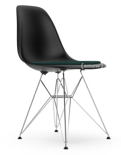 Eames Plastic Side Chair RE DSR, Noir profond , Avec coussin d'assise, Pétrole / marron marais, Version standard - 43 cm, Chromé