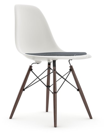 Eames Plastic Side Chair RE DSW, Blanc non-RE, Avec coussin d'assise, Bleu foncé / ivoire, Version standard - 43 cm, Érable foncé