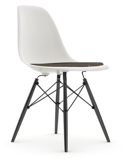 Eames Plastic Side Chair RE DSW, Blanc non-RE, Avec coussin d'assise, Gris chaud / marron marais, Version standard - 43 cm, Érable noir