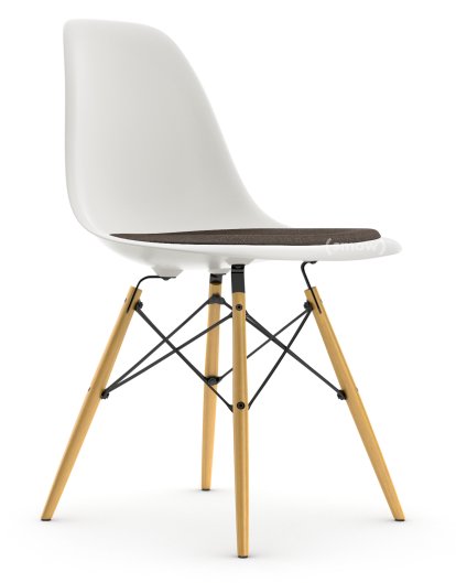 Eames Plastic Side Chair RE DSW, Blanc non-RE, Avec coussin d'assise, Gris chaud / marron marais, Version standard - 43 cm, Frêne tons miel