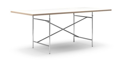 Table Eiermann, Mélaminé blanc avec bords chêne, 200 x 90 cm, Chromé, Oblique, centré (Eiermann 1), 110 x 66 cm