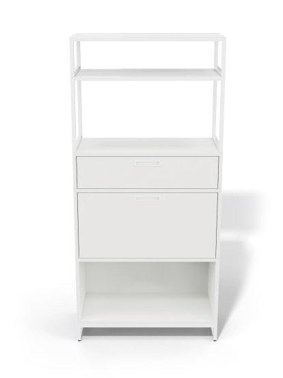 L'étagère M1 de Vario offre un espace de rangement ouvert et fermé permettant ainsi de présenter des objets décoratifs ou de cacher les documents importants. Les lignes épurées et la structure métallique témoignent d'un design industriel moderne qui se combine facilement avec d'autres styles d'aménagement intérieur.