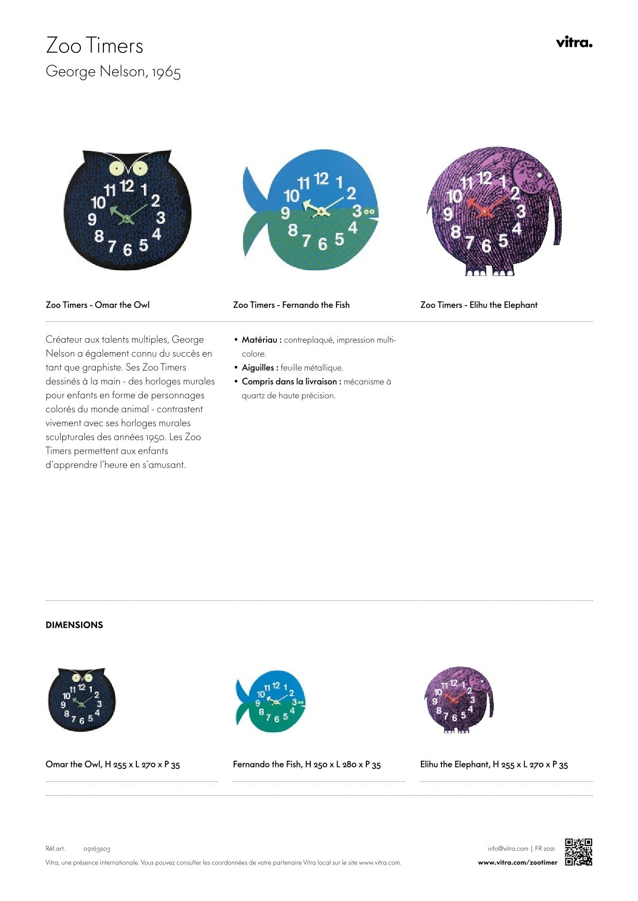 George Nelson a conçu Fernando the Fish by Vitra comme une joyeuse horloge pour enfants en 1965, en contraste total avec les élégantes horloges de bureau qui ont été créées quelques années plus tôt. L'horloge Fernando le Poisson n'est pas tant pour le salon élégant, mais plutôt un ami dans la chambre colorée des enfants, où elle encourage les gens à regarder de plus près le temps qui s'écoule. Avec l'aide des numéros aux formes visiblement différentes, les petits apprennent le temps sans pression et profitent en même temps d'un joyeux compagnon de tous les jours. Les frères et sœurs de Fernando, Omar the Owl et Elihu the Elephant font également partie de la série Vitra Zoo Timers et sont également fabriqués en contreplaqué imprimé en couleurs.