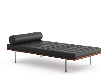À la suite de la création des meubles Barcelona de Ludwig Mies van der Rohe pour accueillir à l’Exposition universelle de 1929 à Barcelone le couple Royal, Knoll International choisit d‘éditer cet élégant et prestigieux ensemble. Le design des meubles Barcelona évoque sans conteste la noblesse, la monumentalité du couple qui devait prendre place sur ceux-ci lors de la cérémonie d’ouverture. La banquette a été conçue peu après pour créer un ensemble de salon des plus élégants. Elle est composée de bois durs, de tubes d’acier ronds et d’un revêtement en cuir de haute qualité capitonné à la main rembourré de mousse comme le repose-tête traversin. Ce dernier, particulièrement confortable, est attaché via des sangles également en cuir précieux. Ludwig Mies van der Rohe n’est pas seulement une figure de l’histoire moderne grâce au design de ces meubles, mais également, grâce à ses créations architecturales. En 1927, il fût en partie investi de l’aménagement du quartier Weißenhof à Stuttgart où il conçut plusieurs maisons familiales. Les meubles Barcelona comptent indéniablement parmi les plus prestigieux classiques du design.