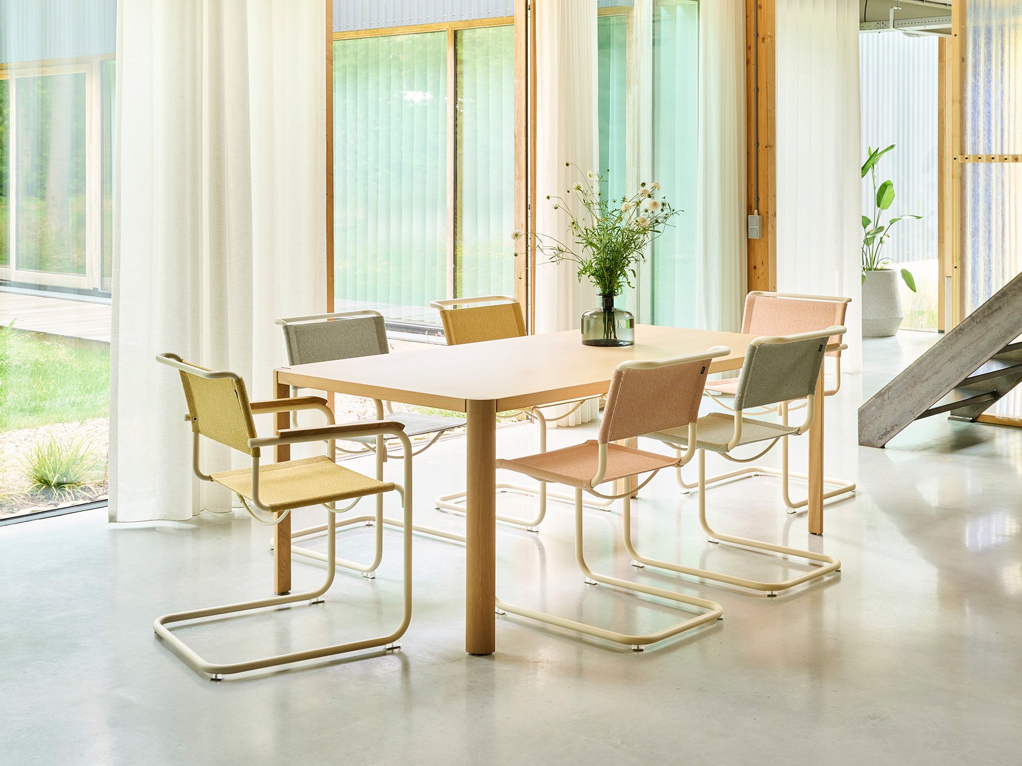 Thonet a introduit de nombreuses nouvelles variantes de la chaise cantilever Thonet, tout en conservant les designs originaux de Mart Stam et Marcel Breuer. Au lieu d'être uniquement revêtues du cannage d'origine, les chaises cantilever Thonet sont désormais disponibles en standard avec un revêtement en maille synthétique robuste en tant que S 32 N et S 64 N. La collection All Seasons présente en outre les chaises en porte-à-faux Thonet dans un nouvel habit, en tant que variantes adaptées à l'extérieur. Avec la chaise S 40, Thonet a également lancé la chaise cantilever originale de Mart Stam en tant que chaise d'extérieur pour la terrasse, le balcon et le jardin.