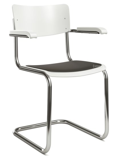 Chaise cantilever S 43 F classique avec accotoirs, Piétement chromé, Hêtre laqué, Blanc pur (RAL 9010), Coussin d'assise avec rembourrage noir, Sans patins