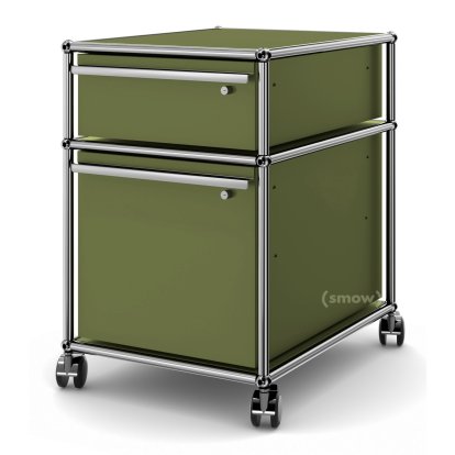 Caisson à roulettes USM Haller avec cadre pour dossiers suspendus, Tous les compartiments avec serrures, Vert olive RAL 6003