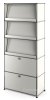 Dans le cadre d'une restructuration au début des années 60, le chef subalterne d'USM a chargé l'architecte Fritz Haller de planifier de nouveaux bâtiments de production et de bureaux. Après l'achèvement, il cherchait une solution appropriée pour l'aménagement intérieur, qui correspondrait à ses idées d'un ameublement flexible et serait basé sur le concept du bureau paysager. C'est ainsi que Fritz Haller a également développé l'aménagement intérieur des bâtiments qu'il a conçus avec le système de meubles modulaires USM. Avec la commande d'équipement de la banque Rothschild à Paris, la production en série de mobilier de bureau USM commence en 1969 et devint une histoire à succès du système d'étagères, qui se poursuit encore aujourd'hui. USM Haller se caractérise toujours par son caractère modulaire et minimaliste : l'étagère USM est construite à partir des trois éléments de base avec lesquels une grande variété de meubles USM Haller peut être conçue en fonction des exigences et des différentes situations d'espace. Aujourd'hui, en plus des buffets USM Haller dans de nombreux designs, la gamme comprend également des tables USM Haller, des caissons roulant USM Haller et d'autres meubles système. Le meuble présentoir USM Haller à deux portes abattantes comporte cinq compartiments, dont deux sont équipés de parois inclinées.