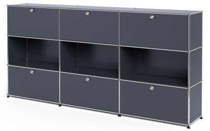 Meuble haut Highboard XL USM Haller, personnalisable, Anthracite RAL 7016, Avec 3 portes abattantes, Ouvert, Avec 3 portes abattantes