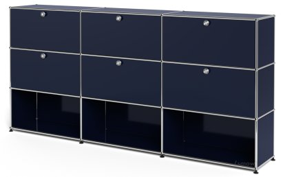 Meuble haut Highboard XL USM Haller, personnalisable, Bleu acier RAL 5011, Avec 3 portes abattantes, Avec 3 portes abattantes, Ouvert