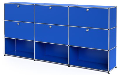 Meuble haut Highboard XL USM Haller, personnalisable, Bleu gentiane RAL 5010, Avec 3 portes abattantes, Avec 3 portes abattantes, Ouvert