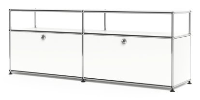 Meuble bas Lowboard L USM Haller avec rehausse, personnalisable Blanc pur RAL 9010|Avec 2 portes abattantes|Avec passe-câbles au centre haut