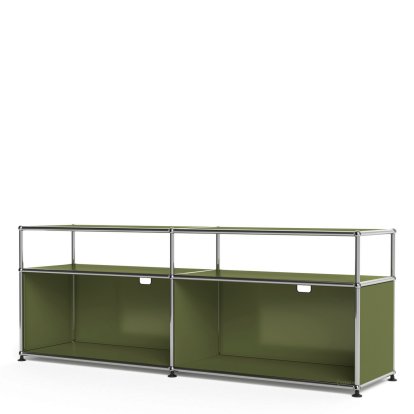 Meuble bas Lowboard L USM Haller avec rehausse, personnalisable, Vert olive RAL 6003, Ouvert, Avec passe-câbles au centre haut