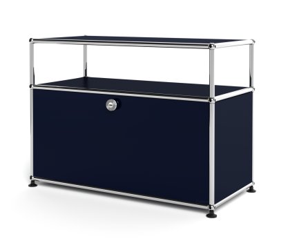 Meuble bas Lowboard M USM Haller avec rehausse, personnalisable, Bleu acier RAL 5011, Avec porte abattante, Sans passe-câbles