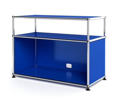 Meuble bas Lowboard M USM Haller avec rehausse, personnalisable, Bleu gentiane RAL 5010, Avec porte abattante, Avec passe-câbles au centre bas