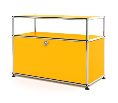 Meuble bas Lowboard M USM Haller avec rehausse, personnalisable, Jaune or RAL 1004, Avec porte abattante, Avec passe-câbles au centre bas
