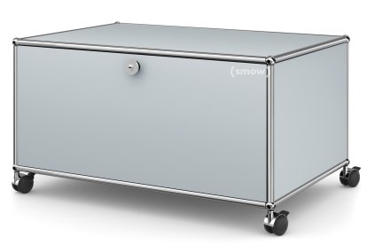 Meuble bas Lowboard TV sur roulettes USM Haller, Avec porte abattante et paroi arrière, Argent mat USM