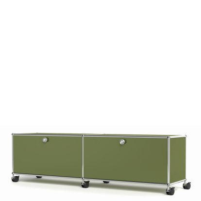 Meuble bas Lowboard TV/Hi-Fi USM Haller, personnalisable, Vert olive RAL 6003, Avec 2 portes abattantes, Avec passe-câbles au centre bas