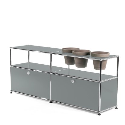 Meuble Sideboard USM Haller pour plantes, Gris moyen RAL 7005, Avec 2 portes abattantes, Avec 3 pots sur la droite, Basalte