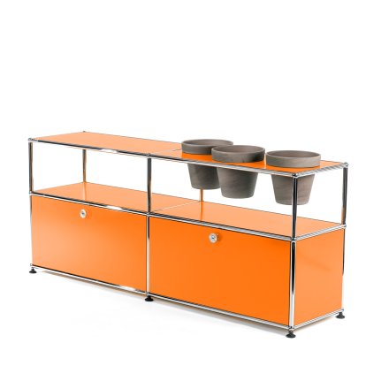 Meuble Sideboard USM Haller pour plantes, Orange pur RAL 2004, Avec 2 portes abattantes, Avec 3 pots sur la droite, Basalte